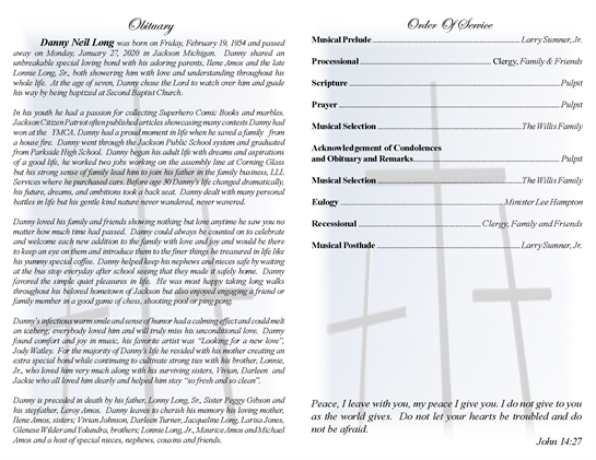 Danny Neil Long was born on Friday, February 19, 1954 and passedaway on Monday, January 27, 2020 in Jackson Michigan. Danny shared anunbreakable special loving bond with his adoring parents, Ilene Amos and the lateLonnie Long, Sr. Read Obituary