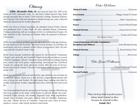 Gibbs Alexander Dale, Jr. was born on June 21st, 1955 to the union of Gibbs Alexander Sr. and Mary Helen Secrest Dale. Both parents preceded him in death. Gibbs had four siblings; Ramona Williams and Dwayne Dale both preceded him Read Obituary