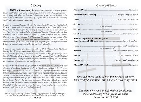Willie Charleston, Jr. was born November 26, 1942 to parents Bessie and Williest Charleston in Beaulah, Mississippi both who preceded him in death, along with a brother; Tommy T. Brown and a son; Steven Charleston. He went to be w Read Obituary